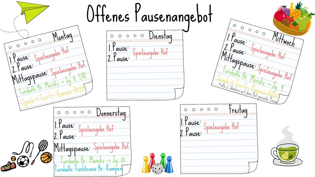 Pausen sind mehr als nur eine Verschnaufpause vom Unterricht – sie bieten Raum für Bewegung, Begegnung und gemeinsame Erlebnisse. Neben Kiosk und Mensa, die wie gewohnt für das leibliche Wohl sorgen, gibt es für die Schülerinnen und Schüler der Abteilung Karlstraße zum neuen Schuljahr ein vielfältiges Pausenprogramm. Je nach Tag stehen unterschiedliche Möglichkeiten zur Auswahl: