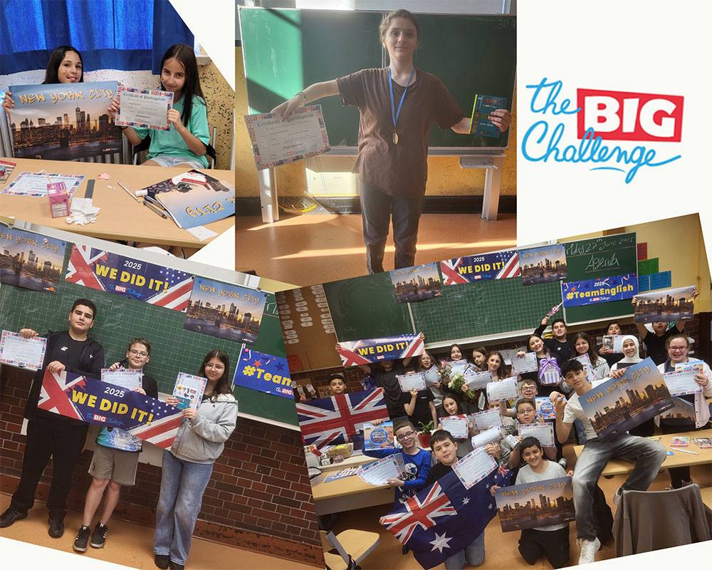 Im Frühjahr 2025 nahmen unsere Schülerinnen und Schüler der Jahrgänge 5, 6 und 7 mit großem Engagement an der Big Challenge teil – einem europaweiten-Wettbewerb, der nicht nur Wissen testet, sondern vor allem Freude am Lernen weckt. Erstmals entschied sich die Fachschaft Englisch für die Online-Version des Wettbewerbs, die mit vielfältigen Aufgaben überzeugte: Neben Wortschatz und Grammatik stand auch das Hörverstehen im Mittelpunkt – ein Bereich, der bei vielen Teilnehmerinnen und Teilnehmer besonders gut ankam und für spürbare Motivation sorgte. Vom 24. März bis zum 11. April 2025 stellten sich die Schülerinnen und Schüler konzentriert und voller Eifer den abwechslungsreichen Aufgaben. Die digitale Durchführung erwies sich als unkompliziert, reibungslos und effektiv – ein voller Erfolg! Ein großes Dankeschön gilt unserem Förderverein, der mit der Übernahme der Hälfte der Teilnahmegebühren vielen Schülerinnen und Schülern die Teilnahme erst möglich machte. Well done, everyone – you made us proud!