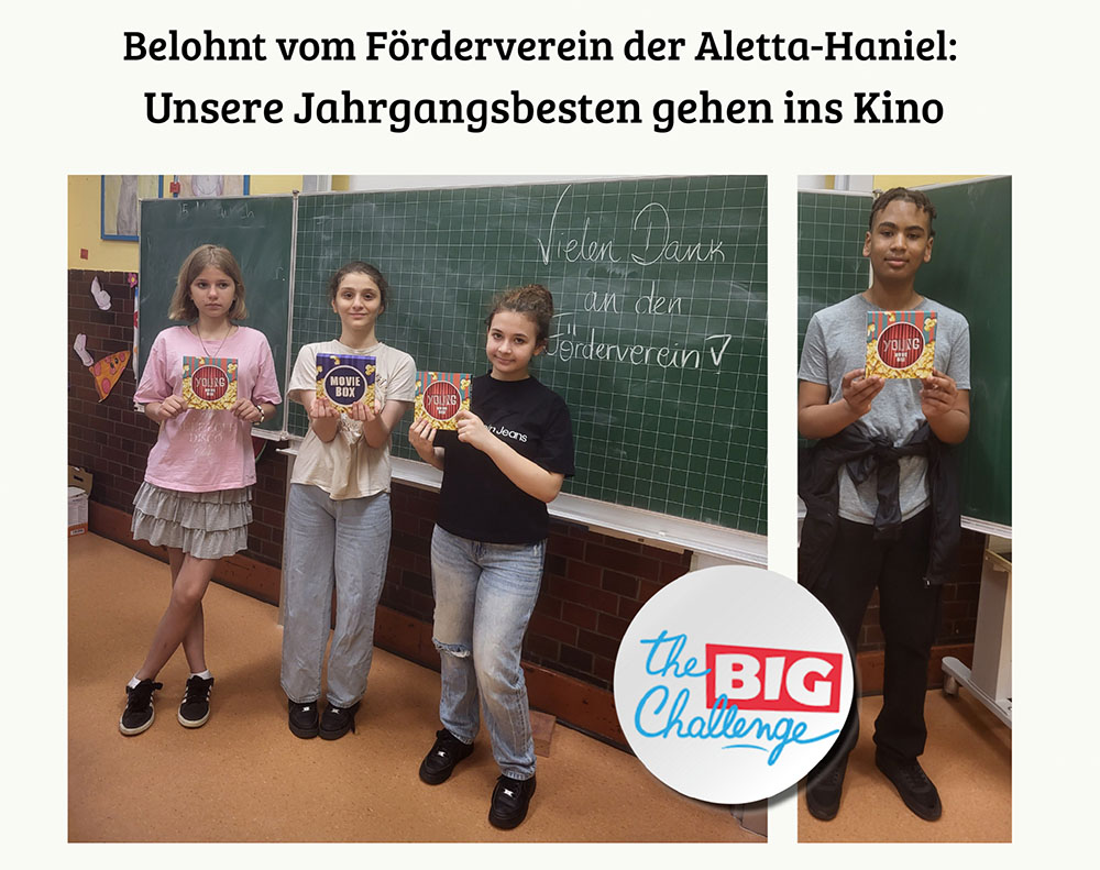 Ein besonderes Highlight: Die Jahrgangsbesten erhielten vom Förderverein eine Ticketbox für das UCI-Kino – ein Geschenk, das mit Begeisterung überreicht wurde. Herzlichen Glückwunsch an Olha (IVK-A1), Avesta (Jg.5) , Gesica (Jg.6) und Gabriel (Jg. 7).