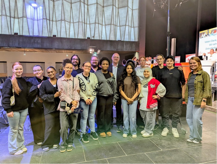 Am 08.09.2025 besuchten Schülerinnen und Schüler der Oberstufe die Jugendwahl-Arena in Duisburg. Die liebevoll von der Jugendbotschaft Duisburg unter der Leitung von Lars Szalek organisierte Veranstaltung lud mit Ständen der verschiedenen demokratischen Parteien zu Snacks, ersten Informationen und Gesprächen mit Vertreterinnen und Vertretern ein.